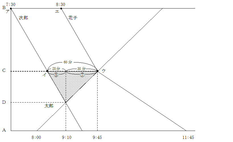 太郎君はD地点→C地点間を、9時45分-9時10分=35分、