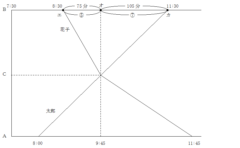 エオ間=9時45分-8時=75分なので、オカ間=75分÷5×7=105分となり、