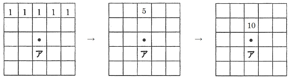 上のように考えると、アに置くAの枚数は、5×2+5=15(枚)とわかります。
