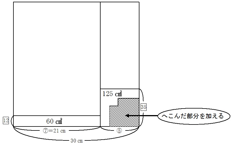 この部分を加えると、しきりの右側の部分の面積は80+45=125(㎠)となります。