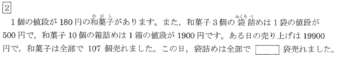 ここから箱詰めが1箱売れるごとに、総売り上げは、1900-180×10=100(円)増えます。