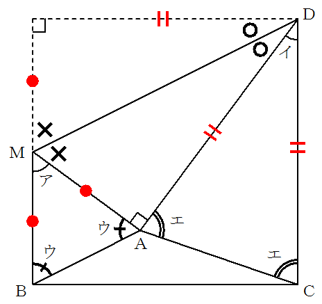角ウと角エの大きさの和は、三角形MBAと三角形DACの内角の和と、