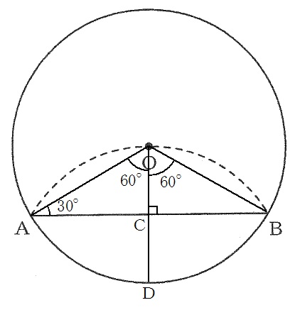 さらに、円の中心OからABに垂線OCを引き、OCの延長と円の交点をDとします。