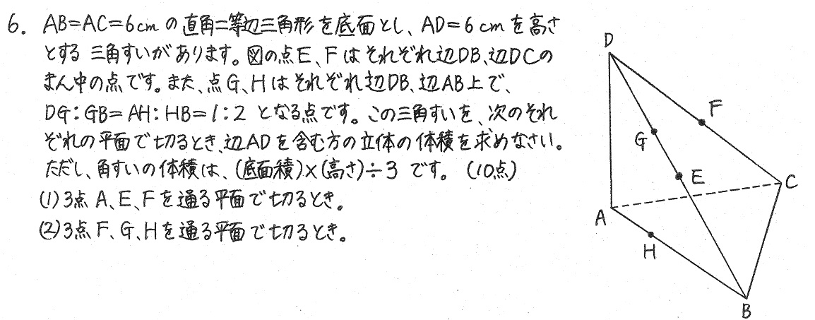 よって、三角すいA-DEFの体積は、6×6÷2×6÷3÷4=9(㎤)です。