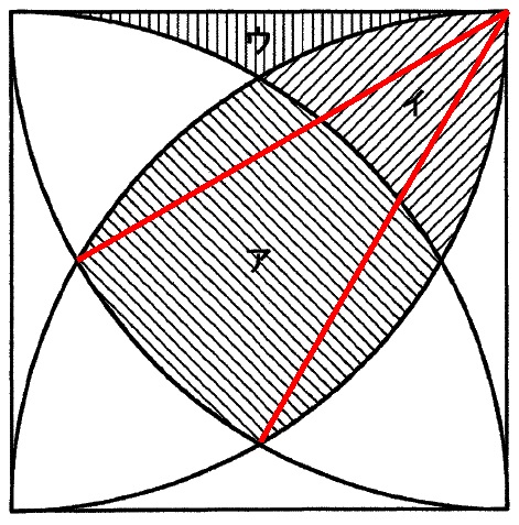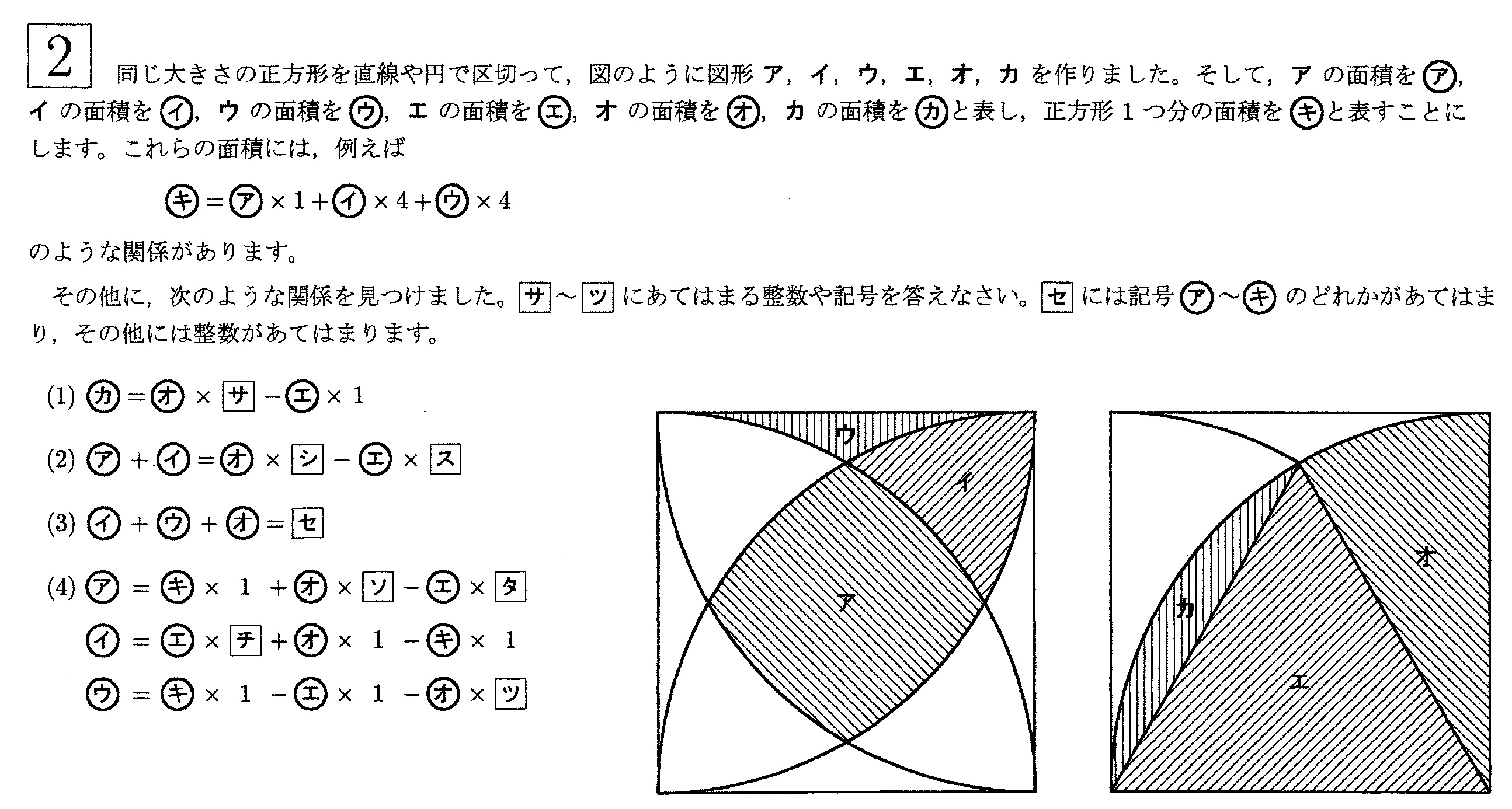 カの面積は、中心角60度のおうぎ形の面積(オ×2)から、正三角形エの面積を引けば求められます。