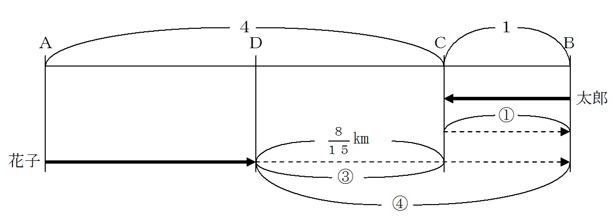 太郎がC地点に着いてすぐに引き返し、追いかけてくる花子とちょうどB地点で出会ったとすると、