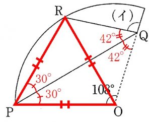 三角形OPQにおいて,角OQP=180-108-30=42(度)・・・⑦です。