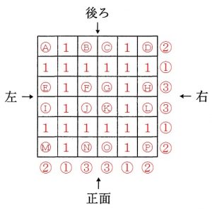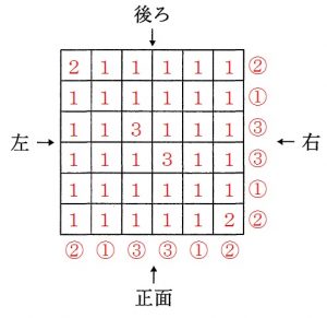 正面と右から見たときに見える立方体の個数(ここでは○数字で表しています)を書き出します。