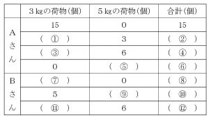 【あ】 Aが運ぶ荷物の合計は、(1)より、15個・13個・11個・9個の4種類です。