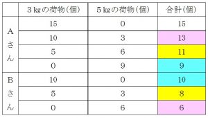 上の表のように、荷物の個数の範囲で、できるだけたくさん運ぶことを考えます。