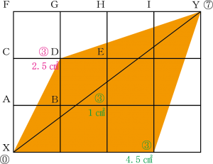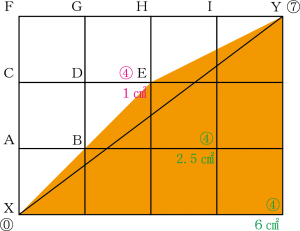 点PがX→A→C→D→G→H→I→Yと進んだとき、この●は全て通ることができるので、三角形PXYの面積が3㎠となる回数は最も多くて4回であるとわかります。