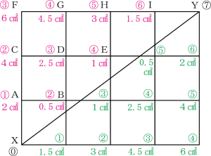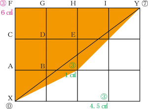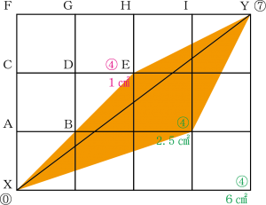 はじめに、交点A~Iの各点に点Pがあるときの、三角形PXYの面積をそれぞれ求めておきましょう。