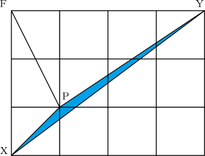 これを示したものが右図で、赤字が三角形PXYの面積、緑字が三角形QYXの面積です。