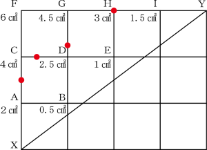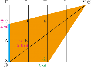 よって、三角形PXYの面積は7-3=4(㎠)なので、このとき点Pは交点Cにあります。