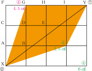 このとき、点Pが交点Gと重なると、三角形PXYの面積だけで4.5㎠となってしまうため、点Pは交点Gにはありません。