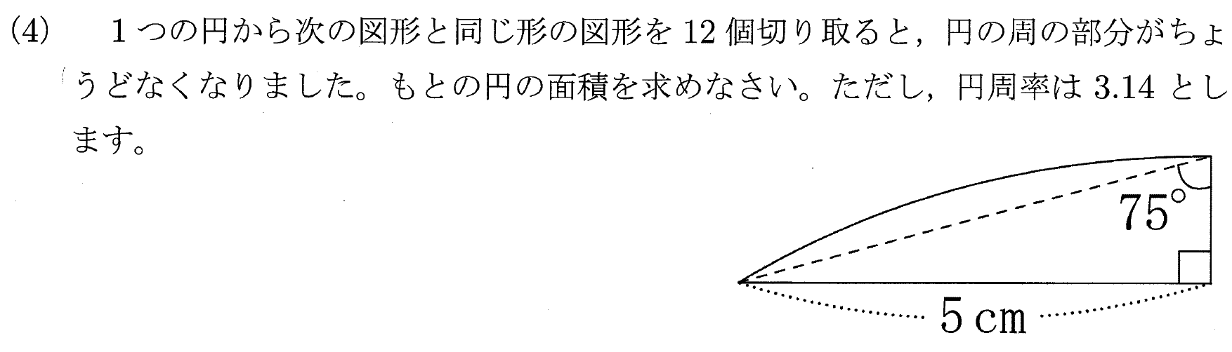 したがって、太線の長さは\(2\times2\times3.14\times\cfrac{15}{360}=3.14\times\cfrac{1}{6}\fallingdotseq0.52\rm{cm}\)です。